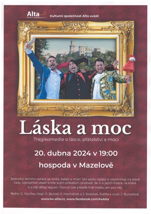 zveme vás do místní hospůdky na představení divadelní společnosti Alta 20.4.2024 v 19,00 hod. - viz přiložený plakát.